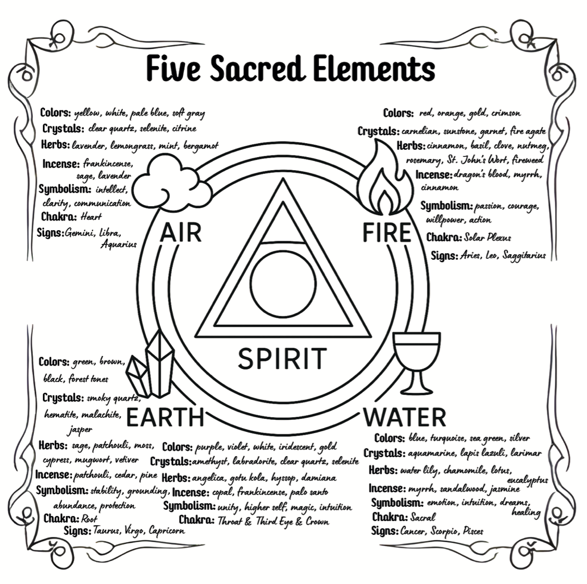 Aerul, Focul, Apa, Pământul și Spiritul au fiecare propriul spațiu dedicat.